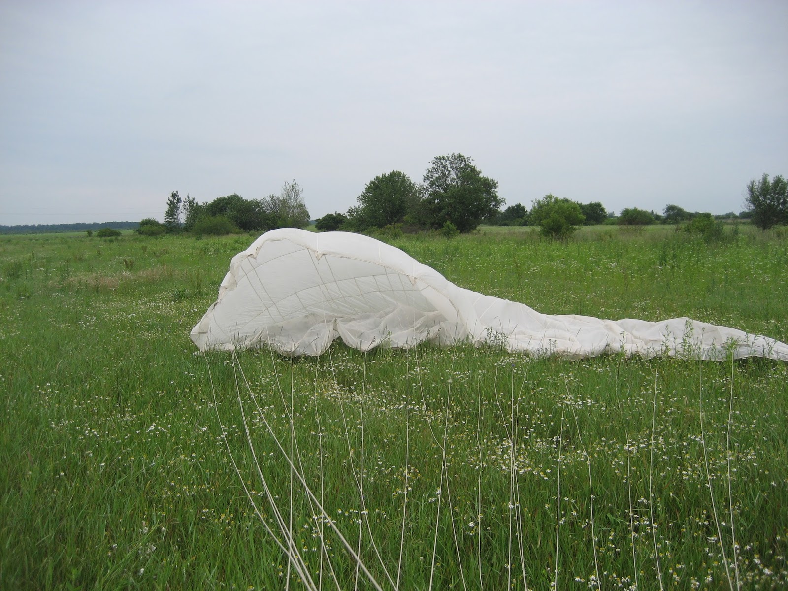 Так от - у Цуневі ми стрибали з купольними парашутами. Вони повністю круглі, і можуть падати тільки вертикально, керувати ними неможливо взагалі. Тобто куди вас вітер поніс там і приземлилися. З літака за один проліт над полем вистрибує чоловік 5-6. Потім літак летить на наступне коло і так далі. Перерви між парашутистами секунди 3-4. Переважно всі перший раз стрибають, тому можуть злякатися і затриматися в дверях, тоді всі хто за ним теж затримуються і відповідно вистрибують далі по ходу літака (а швидкість літака в той момент кілометрів 130 на годину). Останні, якщо не повезе з попередниками, можуть перелетіти місце посадки і впасти на дерева (що є дуже неприємно і травматично), або просто прийдеться тягти на собі парашут лишній кілометр. Швидкість падіння з відкритим парашутом 5 метрів на секунду, і удар об землю дуже навіть відчутний - втриматися на ногах практично не реально.